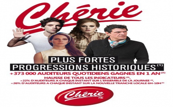 Chérie FM gagne + 373 000 auditeurs sur cette vague 126 000. On retiendra une augmentation de + 22 % des auditeurs à chaque instant et sur l'ensemble de la journée. Mais surtout, il est important de mettre en avant le gain de + 26 % des auditeurs à chaque instant sur la tranche locale...