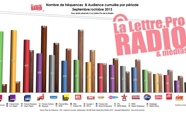 Voilà un diagramme exclusif que vous propose l'équipe de La Lettre Pro de la Radio. Comme chaque année, nos experts ont décidé de mettre en avant le nombre de fréquences des principales stations françaises par rapport à l'audience cumulée. Pour répondre à cette question : non, l'audience ne dépend...