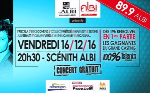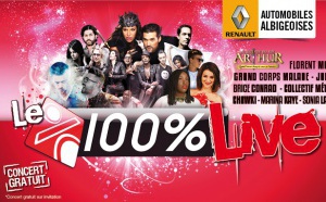 Vendredi 1er décembre à 20h45, 100 % organisera un concert gratuit en partenariat avec la ville d’Albi : le "100 % Live". Sur la scène du Scénith, aux Parc des expositions, se produiront Clare Maguire, Léa Paci, Lisandro Cuxi, Eugénie, Charlie Boisseau, Ycare, Lou, Cuenca, ou encore Liam et Malo… Cet événement sera retransmis en direct sur l'antenne de 100% et sur centpourcent.com.