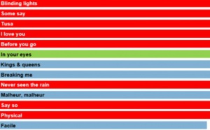 L'agrément des auditeurs aux 30 titres les plus entendus en radio (source Yacast Panel de 140 stations du 27 octobre 02 novembre 2017). Enquête HyperWorld auprès de 300 répondants entre 15 et 49 ans, France métropolitaine, auditeurs réguliers de stations musicales.