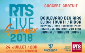 Après le concert "RTS Live" à la salle Victoire 2 de Montpellier en février, le "RTS Live" du Printemps aux arènes de Palavas en mai, RTS revient pour fêter l’été avec le "RTS Summer Live", le mardi 24 juillet à Narbonne. Ce "RTS Summer Live" est un concert gratuit ouvert à tous (sans invitation) offert par la radio RTS et la ville de Narbonne.