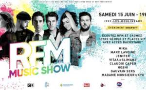 Le prochain RFM Music Show, concert en plein air, proposera une belle affiche le samedi 4 juin dès 19h, au Parc départemental de l’Ile Saint-Germain à Issy-Les-Moulineaux. Sur la scène se succèderont, Christophe Mae, Frero Delavega, Marina Kaye, De Palmas, Vianney, Kids United, Les 3 Mousquetaires, Julian Perretta, Amir, Boulevard des Airs, Les Innocents, Imany et d’autres surprises… Il s'agit d'un événement gratuit et ouvert à tous.