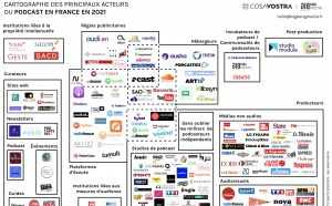 Pour la 3e année consécutive, CosaVostra (cabinet de conseil en innovation et agence digitale) publie sa cartographie des acteurs du podcast en France. La cartographie recense l’ensemble des acteurs qui contribuent à professionnaliser le podcast : producteurs, incubateurs de podcast, plateformes d’écoute, régies publicitaires, institutions liées à la propriété intellectuelle, hébergeurs,..
