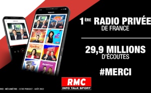 En août, RMC se positionne comme la première radio privée de France dans le classement mensuel eStat Podcast. La radio a totalisé 29 934 000 d'écoutes et téléchargements. "L'After Foot", l'émission emblématique de la station, décroche la première place des émissions les plus téléchargées...